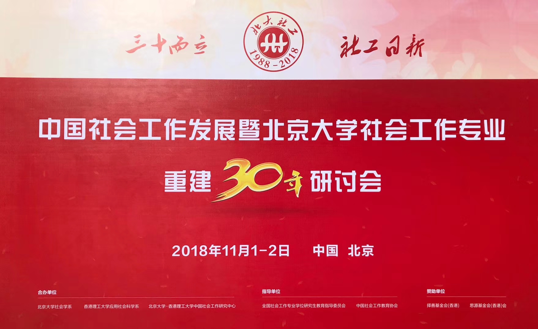 2018年11月1日上午,我系师生共计二十余人在吕新萍老师带领下,前往北京大学英杰交流中心。参加了由北京大学社会学系、香港理工大学应用社会科学系、北京大学—香港理工大学中国社会工作研究中心举办的“中国社会工作发展暨北京大学社会工作专业重建三十年学术研讨会”。本次研讨会邀请了北大校领导、香港理工大学校长高级顾问阮曾媛琪教授、中国社会工作教育协会名誉会长王思斌教授、中国社会工作教育协会会长徐永祥教授、中国社会工作重建初期院校代表、国际社会工作教育联盟主席Annamaria Campanini教授等嘉宾到场。