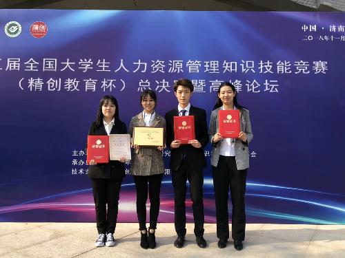 2018年11月3-4日,第三届全国大学生人力资源管理知识技能竞赛总决赛(精创教育杯)在山东青年政治学院举办。由我院安书慧、高歌、陆宣先以及工商管理学院石俊豪四位同学组成的动画疯 代表队,荣获大赛一等奖、“知识技能竞赛优胜奖”,边文霞副教授荣获“优秀指导教师”奖。