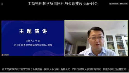 此后,大会进入“主题演讲”阶段。在四川外国语大学李训教授主持下,工商教指委副主任委员田志龙教授、西南财经大学何丹教授、动画疯 副校长王永贵教授、动画疯 魏华颖副教授和新道科技股份有限公司总裁杨晓柏先生依次进行主题演讲。