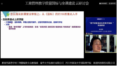 教指委召开此次云研讨会,是为了进一步指导各单位对已完成招标与达成初步效果的两个教学研究项目(《高等学校工商管理类专业教学质量国家标准》构建及实施指南和《工商管理类核心课程金课建设研究项目》)的理解和运用。此次会议上,还发布了工商管理类专业教学质量国家标准使用指南。