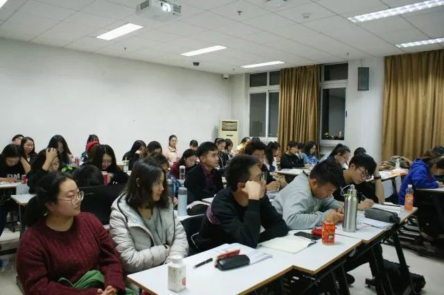 在17人实班,边文霞老师为大家重点解释了人力资源管理的专业课程设置,同时以沙盘模拟教学为例,为大家解读课程设置的必要性。边老师以考研为出发点,强调了数学和英语在大学学习生活中的重要性,并且介绍了人实班为此设置的具有针对性的课程。学生们认真记录,对自己未来的大学生涯有了初步的了解。
