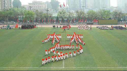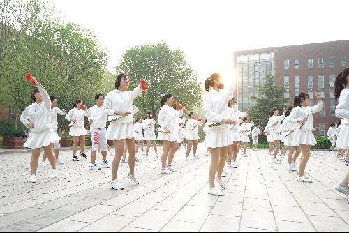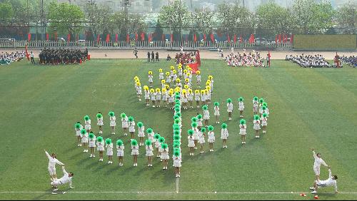 在各院系学生团体操的展示环节中,劳经学院队伍于第十三个登场。学生们喊着响亮的口号,随着高扬挥舞的院旗,奔向操场中央。大家澎湃的激情、高昂的斗志瞬间点燃全场。在3分43秒的展示中,劳经人手持翻花绘就出一幅幅亮丽的图景,CUEB、花朵、三棱锥、奔跑点燃火炬、汉字“梦”,他们用生动的元素传递着青年学子的朝气。旋转、跳跃,他们像跃动的精灵。萌动的春花,象征着青春与活力。