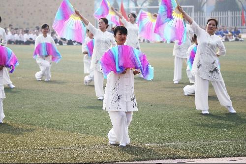 我院张琪、吴博棣、赵建新、孙乐、李楠老师参与教工团体操《扇舞丹青》的表演。他们手持彩扇,舞姿翩翩,整个表演如行云流水,亦柔美亦刚强,引起了看台上师生们的阵阵掌声。