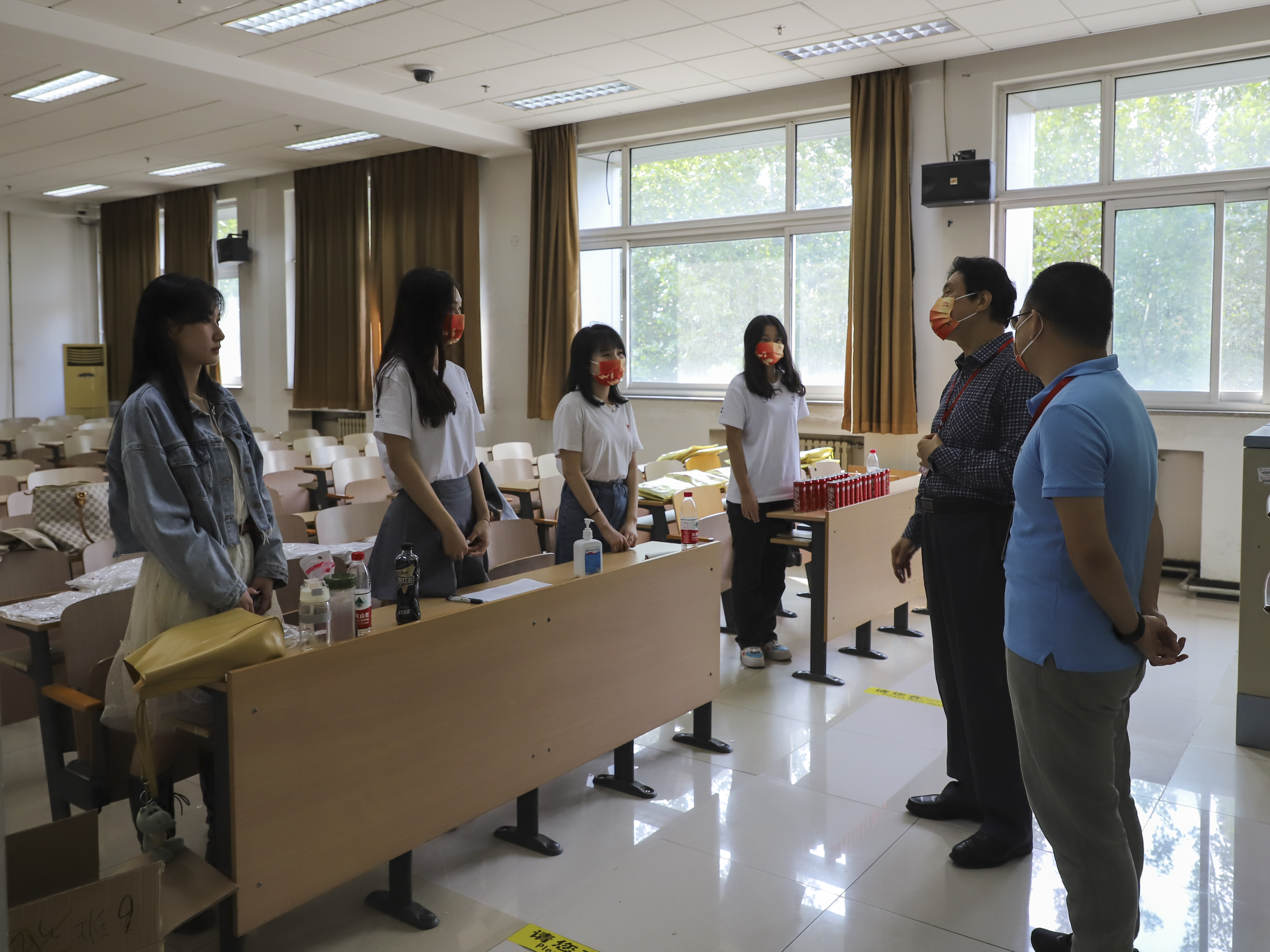 为避免大规模人员聚集,家长不能进入校园,学长学姐们积极承担起为“新面孔”服务的重任!他们身穿院服,佩戴劳经定制口罩,在各个岗位忙碌着。大门志愿者负责接待引导,宿舍志愿者负责办理入住及搬运行李,报到处志愿者负责帮助新生完成注册手续……各位迎新工作人员及时引导,积极热情,服务周到,校园里随处可见忙碌的身影,大家井然有序。