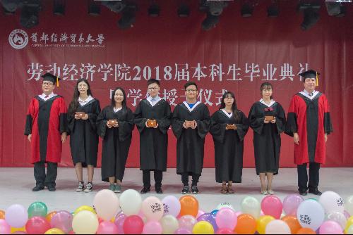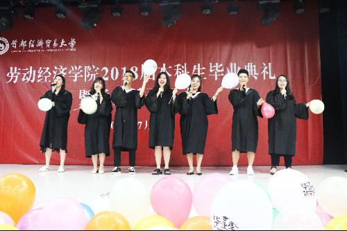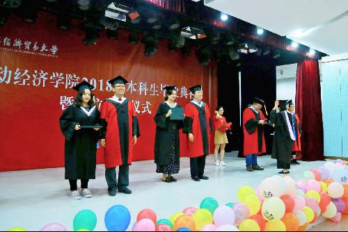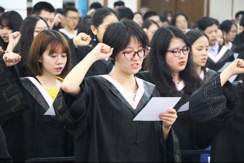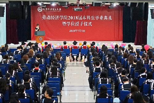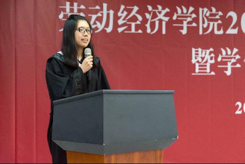 毕业典礼上,吴含带领所有毕业生做“劳经学子宣誓”,“……感恩母校、感恩社会、感恩国家,致力于祖国民族的事业兴盛,实现价值,回报师长。乐学、爱业、报国!”的庄严誓词响彻会场。