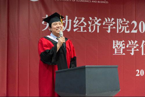 2014级社会工作班吴含代表全体毕业生发言,表达了对母校培养、恩师教诲、家人支持与同窗陪伴的感激之情。她坦言,遇见劳经是一种缘分、更是一种幸运和荣耀,在未来的生活、学习和工作中,将继续秉承校训精神,崇德尚能、经世济民,争做“爱国、励志、求真、力行的新时代有为青年”,在各行各业中奉献自己的青春力量!