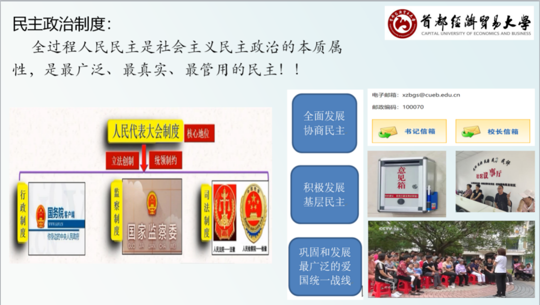 在《公共伦理学》课堂上,王永梅老师将我国的政治制度和全过程人民民主相关内容融入到社会制度及其作用的讲述当中。社会制度是与社会结构相适应的、维系社会关系和社会活动而由社会管理组织制定的一系列规范形式或规范体系,它可以调整社会的政治关系、经济关系、法律关系、伦理关系以及宗教关系。她以制度调整政治关系为例来讲,看制度是如何实现人民当家作主的。我国是工人阶级领导的、以工农联盟为基础的人民民主专政的社会主义国家,国家一切权力属于人民。