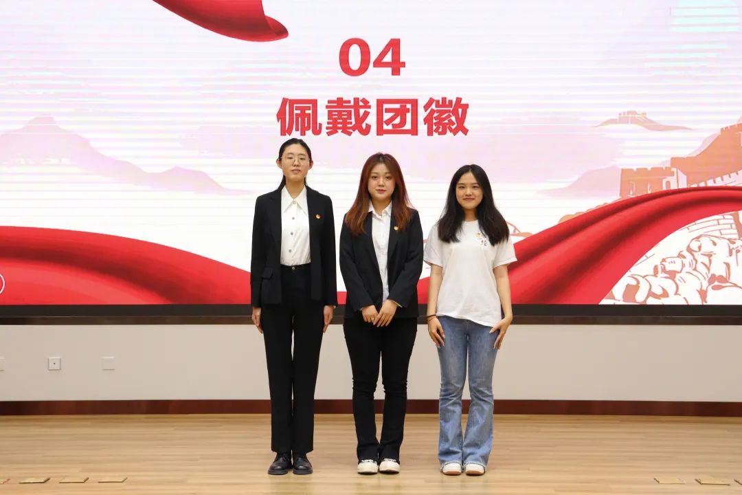 朱佳颖宣布新团员名单,并为新团员佩戴团徽。2020级劳动关系班团支部李玥潼、2021级1班团支部常润林等2名同学光荣的加入了共青团。