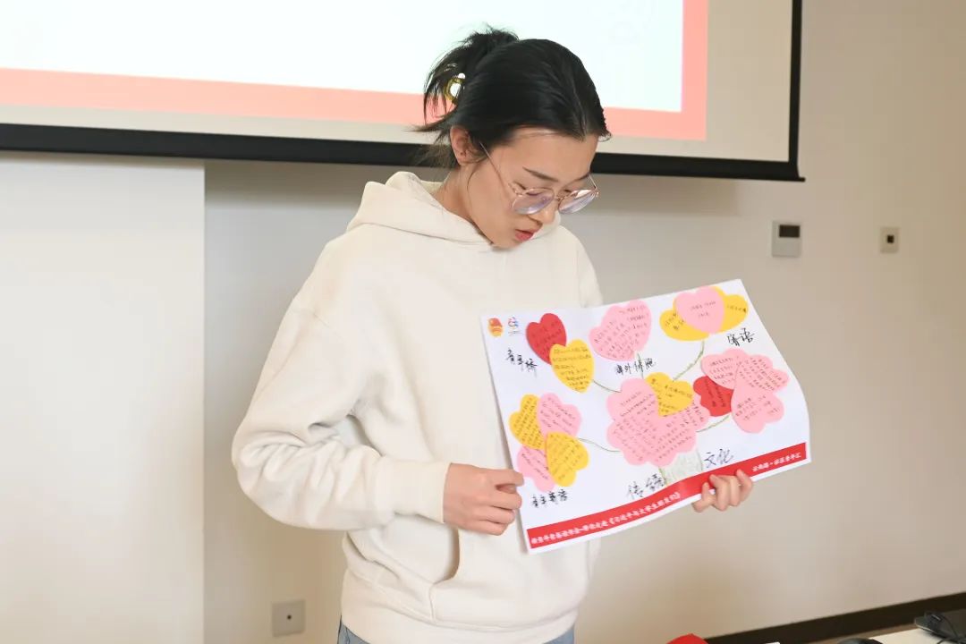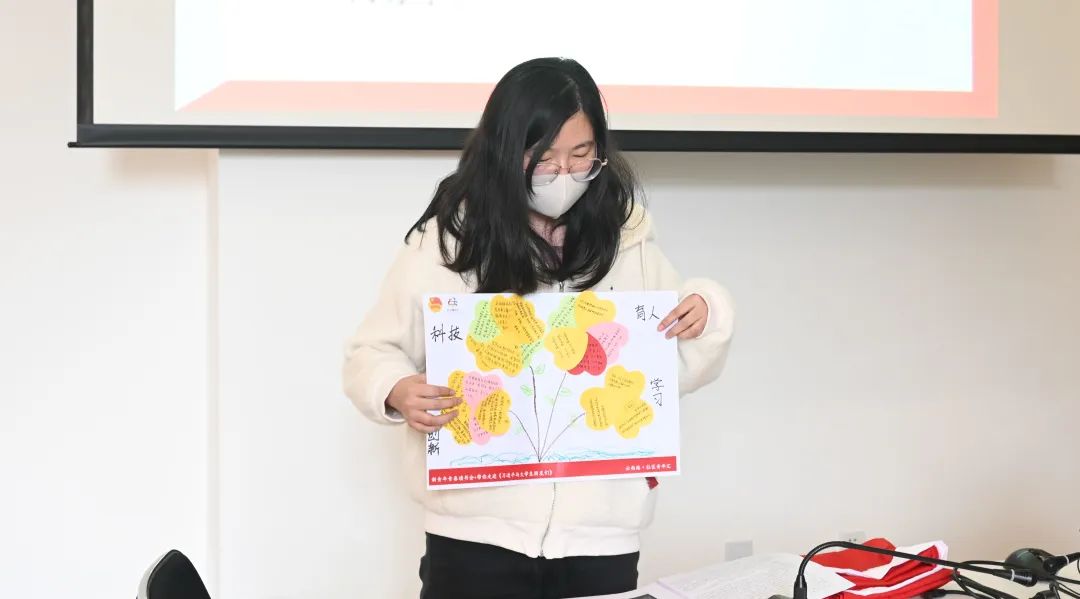 随后进行小组活动,四组同学分别阅读《习近平与大学生朋友们》的不同章节,写下自己的感想或最有感触的句子,共同合作绘制成“智慧树”进行分享。