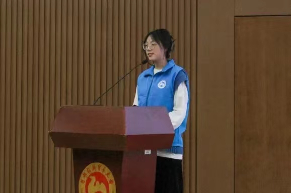 最后2021级劳经2班的王佳艾,她作为行知学校支教志愿者代表,在支教过程中她鼓励不善言辞的孩童勇敢表达自我,而后收到小女孩亲手折叠的千纸鹤。她希望可以有更多人加入志愿服务这个大家庭,让社会因为我们变得更有温度。