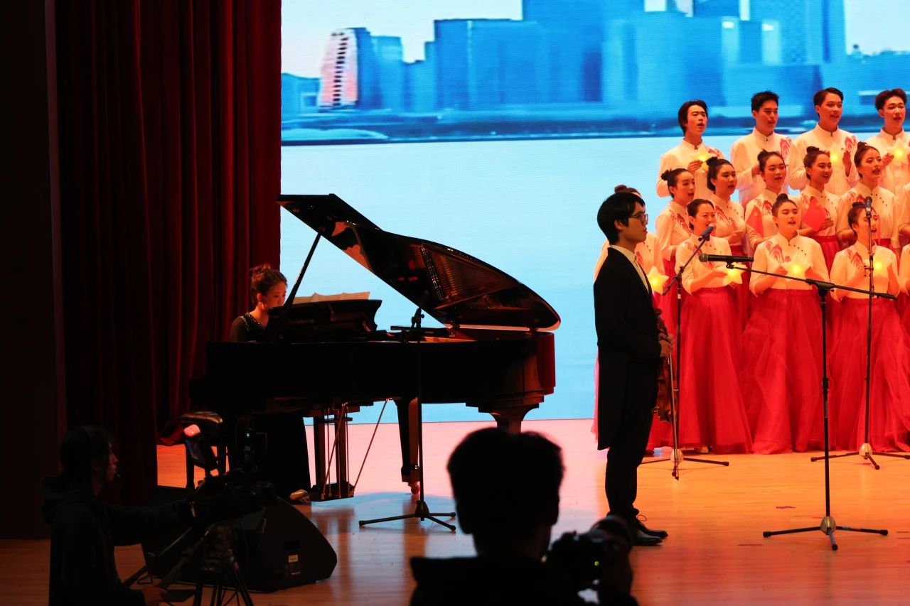 “归港的船帆从灯塔掠过,追梦脚步月下交错;广场焰火在节日诉说,星空升腾时代的巍峨。”伴随着悠扬婉转的女高音,沉稳有力的男低音打开了浪漫而丰富的时代画卷。在这片灯塔辉映的潮汐中,无数人民肩负起构建人类命运共同体的时代重任。温暖动听的和声描绘着万家灯火里的美好生活,传达着同学们对新时代中国和谐安宁的热烈赞颂。