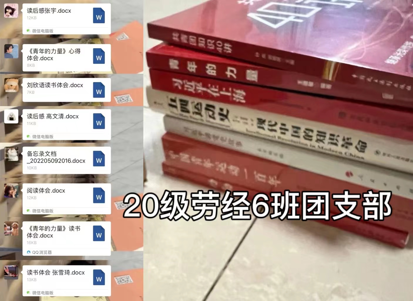 20级劳经1班团支部响应学院分团委的号召,团支部在全班团员中开展“读书盲盒”分享活动。让团员们吸收营养、滋润精神、提高眼光、开拓视野、改进行为。团支部建立学习机制。有利于团员们的及时沟通、交流、讨论的学习环境,形成个人自学与集体交流,短期学习与长期学习,理论学习与生活实践相结合的多样化学习方式。在读书分享会中讨论本班团员2022-2023学年读书活动计划,每个成员会结合自身实际,制定一学年读书计划。且读书分享会定期举行,组织读书沙龙,读书征文竞赛等丰富多彩的读书活动,交流读书心得,让本班团员乐于读书,在读书中真正的成长起来。