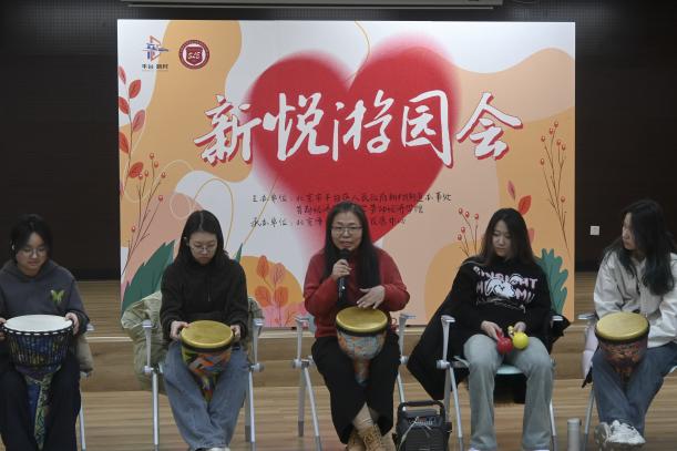 在动态互动环节,心理咨询师白冰带领同学们开启了一段充满活力的“鼓圈互动”之旅。在介绍完非洲鼓的使用方式后,白冰老师率先示范了几种基础节奏,接着鼓励大家创作自己的节奏。她还带领大家伴着音乐跳起了盘子舞。同学们都沉浸在这热闹的氛围和欢快的节奏里,并借此过程拉近了与彼此间距离。