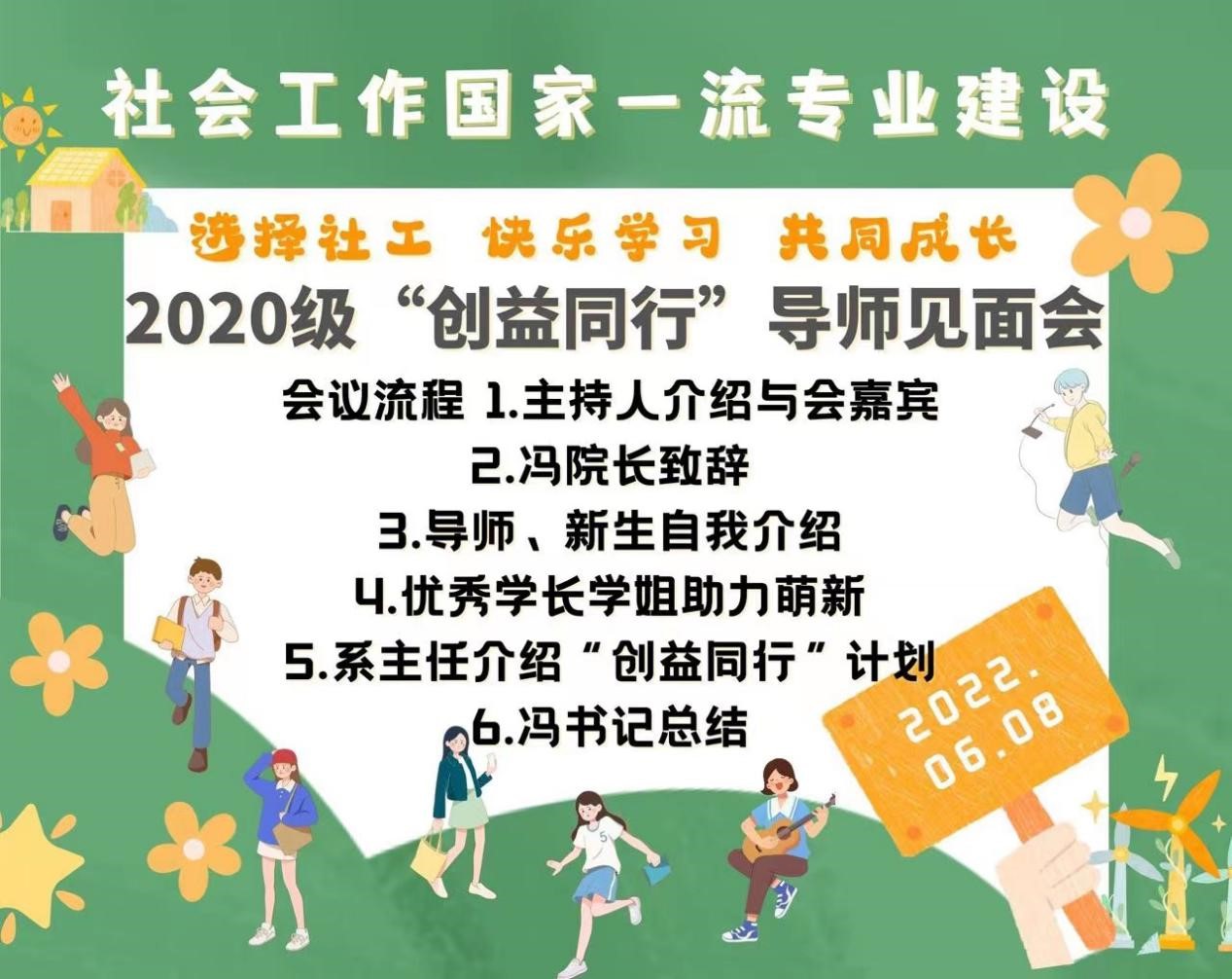 为全面推进社会工作国家一流本科专业建设工作,6月8日下午,动画疯 社会工作系在线上举办了“社会工作国家一流本科专业建设暨2020级‘创益同行’导师见面会”。学院党委副书记、院长冯喜良、党委书记冯博出席会议,副院长范围对本次会议的召开给与了关注和支持,社会工作系全体教师,18级、19级社会工作专业学生代表和2020级社会工作专业全体同学参会,会议由2020级社会工作专业班主任曹家宁老师主持。