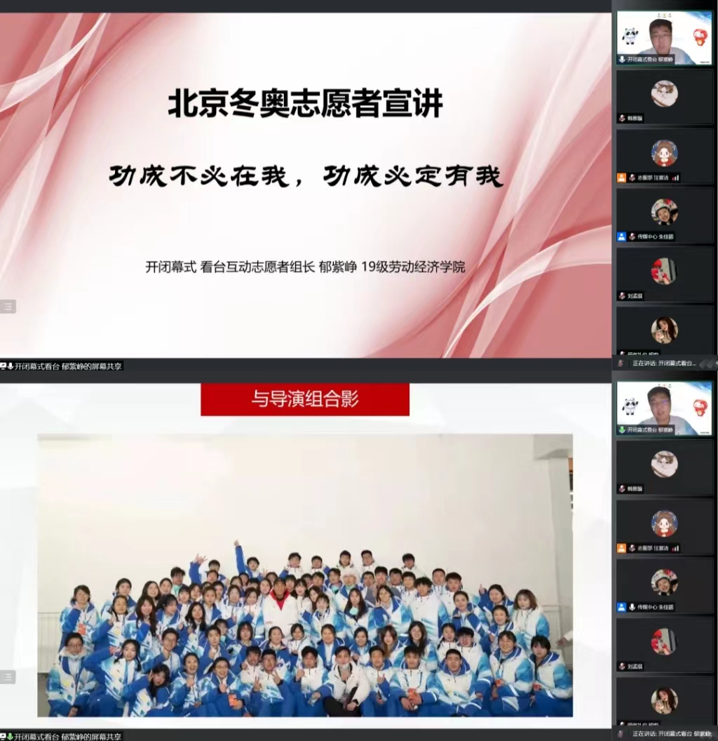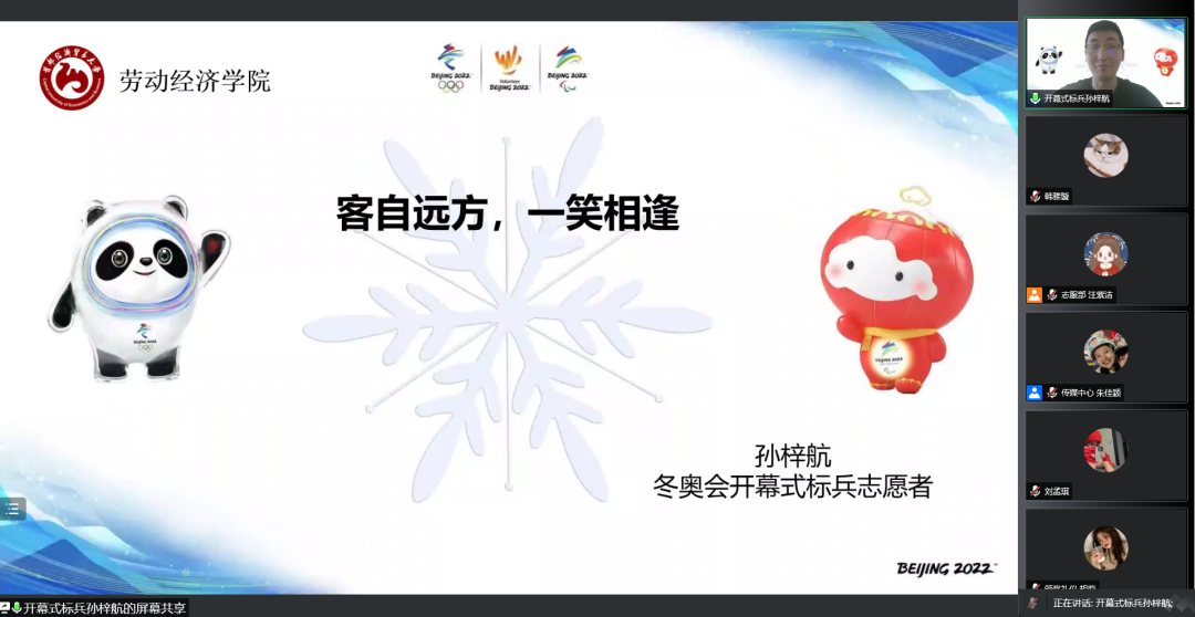 2022年5月14日,动画疯 青春心向党,奋进新征程“微火成炬”冬奥精神主题分享会在线上腾讯会议顺利开展。9位来自各个领域的冬奥志愿者对自己在志愿服务中的独特故事和切身感悟进行分享,展现出劳经学子在冬奥这堂思政大课中的精神风貌,以青春之名,向劳经学子传递强烈的爱国热情和政治担当。