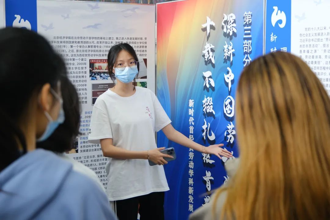 最后,由王佳艾为大家讲解展览的第三篇章——“深耕中国劳动学科 十载不辍扎根首都”,主要为大家介绍了新时代首经贸在劳动科学研究方面取得的新成就、新发展。王佳艾为同学们介绍了劳经学院人才培养体系和学科建设体系的由来和根据以及学院对培养同学们的劳动实践能力的重视。