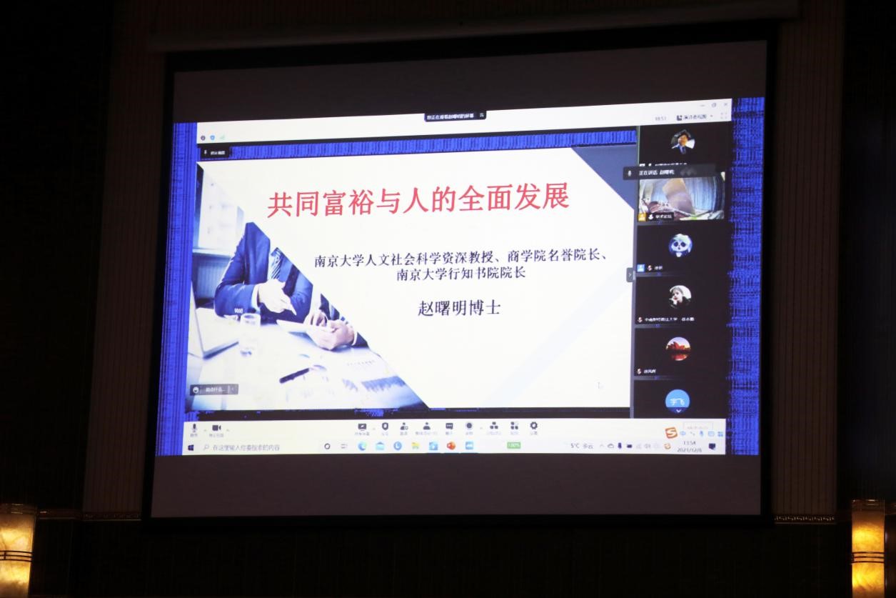 论坛以线上线下相结合的方式进行。南京大学人文社科资深教授、商学院名誉校长、行知书院院长、博士生导师赵曙明应邀为同学们做关于“共同富裕与人的全面发展”的主题演讲,赵老师从共同富裕的背景、共同富裕的必要性、共同富裕与人的全面发展和共同富裕与社会生态四个方面具体展开了论述,最后得出了人的全面发展和组织生态助力于共同富裕的重要结论。