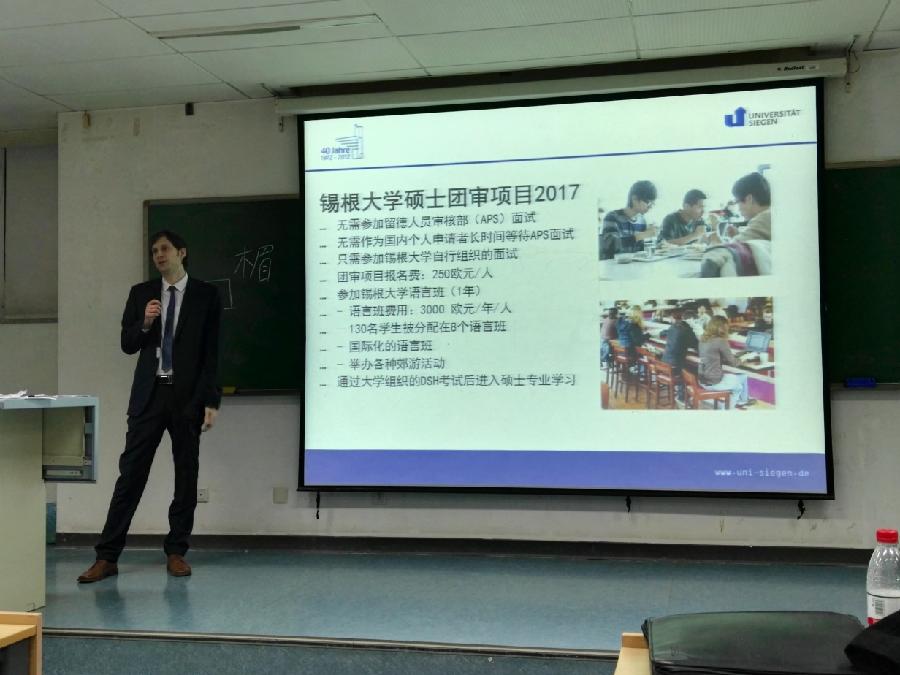 活动的最后一部分为德国锡根大学交流项目宣讲会。锡根大学外事办负责人Christian Gerhus对锡根大学及该项目进行了详细的介绍,幽默的语言以及细致的讲解吸引了在座的同学。宣讲会结束后,我院以及外院部分同学对该项目表现出很大的兴趣,继续与主讲人就课程选择、语言学习等相关问题进行深入交流。