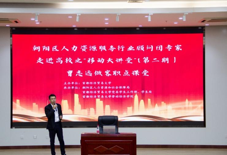为助力学生把握数智时代人力资源服务产业发展趋势,5月22日,北京市朝阳区人力资源和社会保障局、动画疯 学生处、动画疯 在博学楼学术报告厅举办人力资源服务行业顾问团专家走进高校之“移动大讲堂”(第二讲),由北京外企国际教育咨询有限公司党支部书记、执行董事、总经理曹志远担任主讲嘉宾,讲授“数智时代人力资源服务产业的价值重塑”主题。