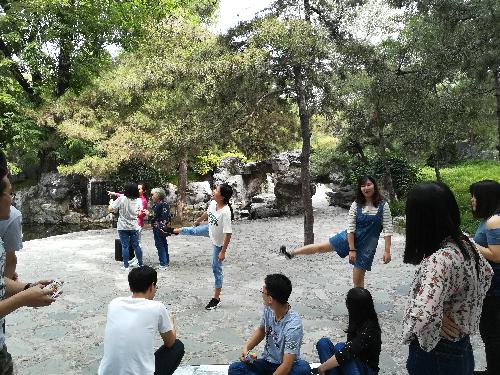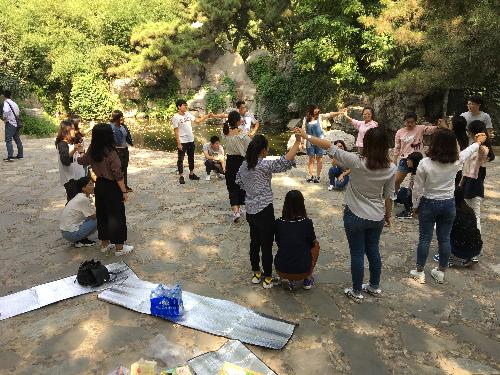 穿过风景秀丽的公园,我们找到了一片空地便开始了今天的趣味游戏和交流活动。为了组织这次的“破冰”活动,小伙伴们设计了7款不同的游戏。首先是“硬币凑钱”:所有参与者围成一个圆圈,女生每人代表5毛,男生每人代表1块。裁判说一个钱数,参与者自行组队达到要求的数则算赢,组错或者没队的参与者为输进行惩罚。第一轮比赛中,三个成员因没有成功组队成为遗漏人员,接受惩罚的他们给大家演唱了《小酒窝》,虽说有些跑调,但队员们的声音还算甜美。第二轮比赛中四个淘汰队员表演了四小天鹅,那场面也是相当有喜感。第三轮输掉比赛的倒霉孩子中给大家演唱了她们的班歌《一生有你》,抛开忘词、跑调不谈,还是不错的……